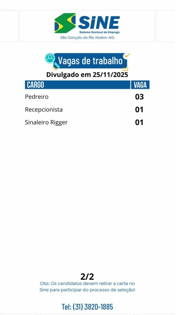 Médio Piracicaba Muitas vagas de emprego para hoje, terça-feira (25/11) no SINE São Gonçalo do Rio Abaixo 25 de novembro de 2025 portaldomediopiracicaba@gmail.com Redação