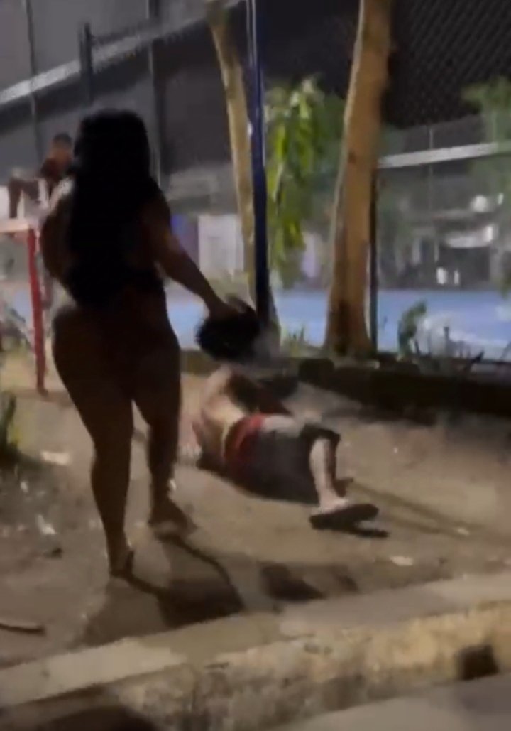 Em certo momento a mulher bunduda tomou o capacete que estava na mão do homem, correu atrás dele e desferiu uma capacetada na cabeça do homem que foi imediatamente a nocaute.
