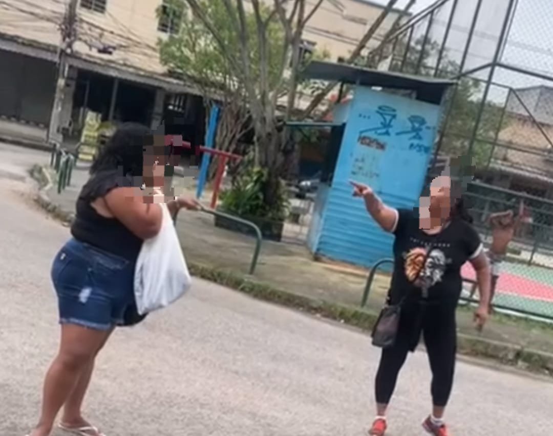 A de calça preta seria a esposa e ela falava para a outra (de bermuda jeans azul) sair da vida do marido dela.