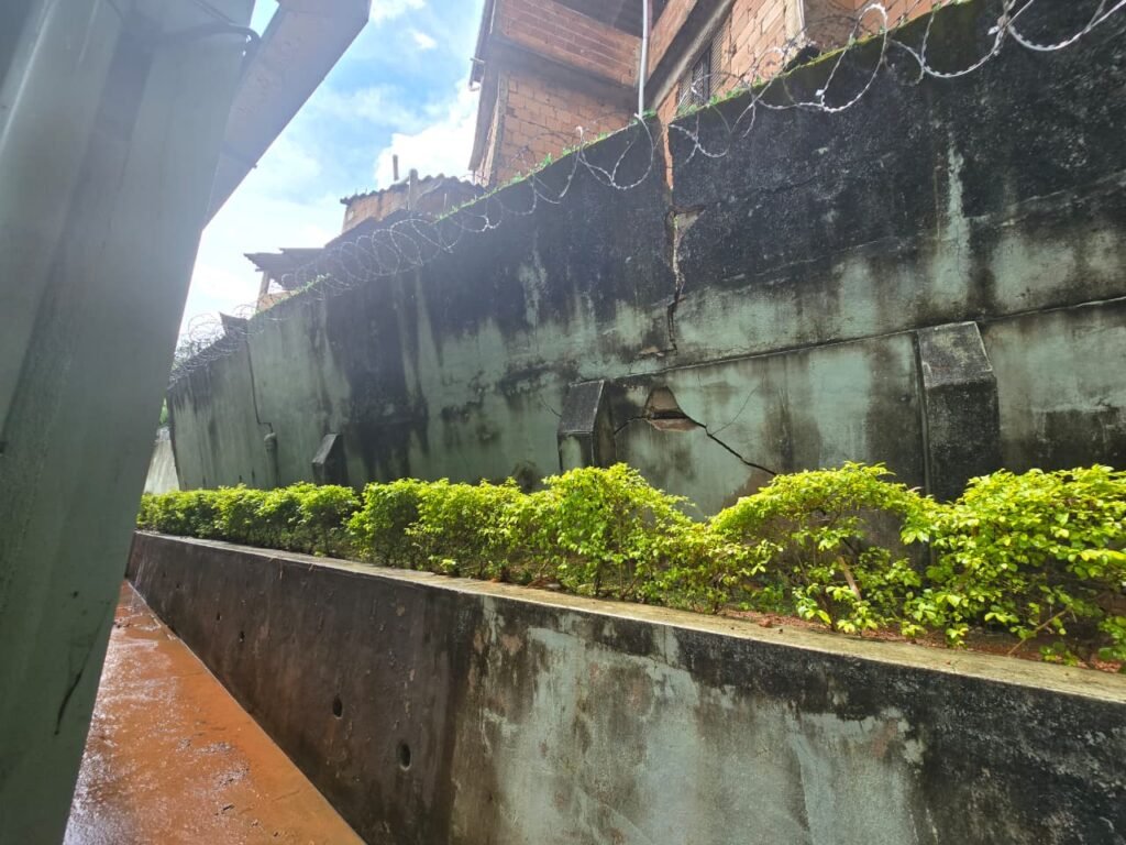 Devido às chuvas (conforme relato), um muro com cerca de 3 metros de altura, que pertence à casa ao lado do refeitório da unidade hospitalar, estaria com risco de queda.