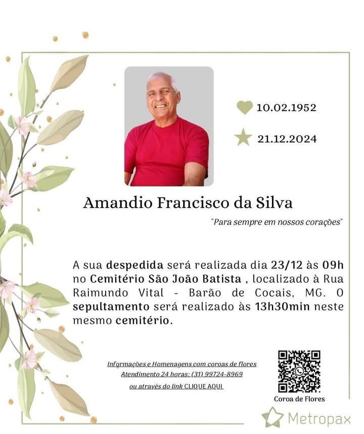 A Redação do Portal do Médio Piracicaba expressa o sentimento de condolências a todos os amigos e familiares do Sr Amândio Francisco da Silva que já está morando ao lado de Deus.