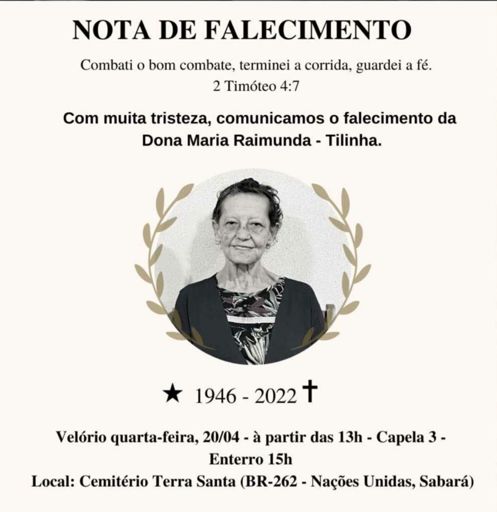 Geral Nota de falecimento Dona Maria Raimunda (Tilinha) 20 de abril de 2022 portaldomediopiracicaba@gmail.com Redação