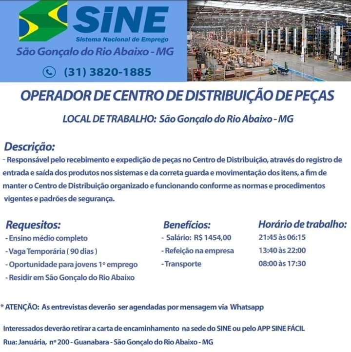 Oportunidade de emprego! SINE – São Gonçalo do Rio Abaixo – MG sorte aos candidatos.