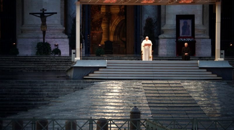 A imagem do chefe da Igreja católica orando sozinho diante da imensa esplanada pelo fim da guerra contra um inimigo invisível é quase cinematográfica
