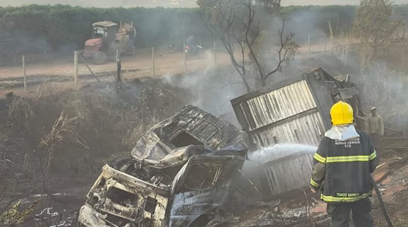 Na tarde desta quarta-feira (23), um caminhão que transportava 24 bois perdeu o controle da direção, saiu da pista e tombou, vindo a se incendiar nas proximidades do km 515 da BR-365.