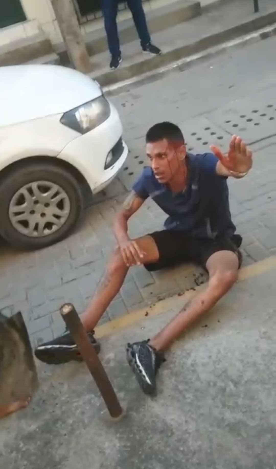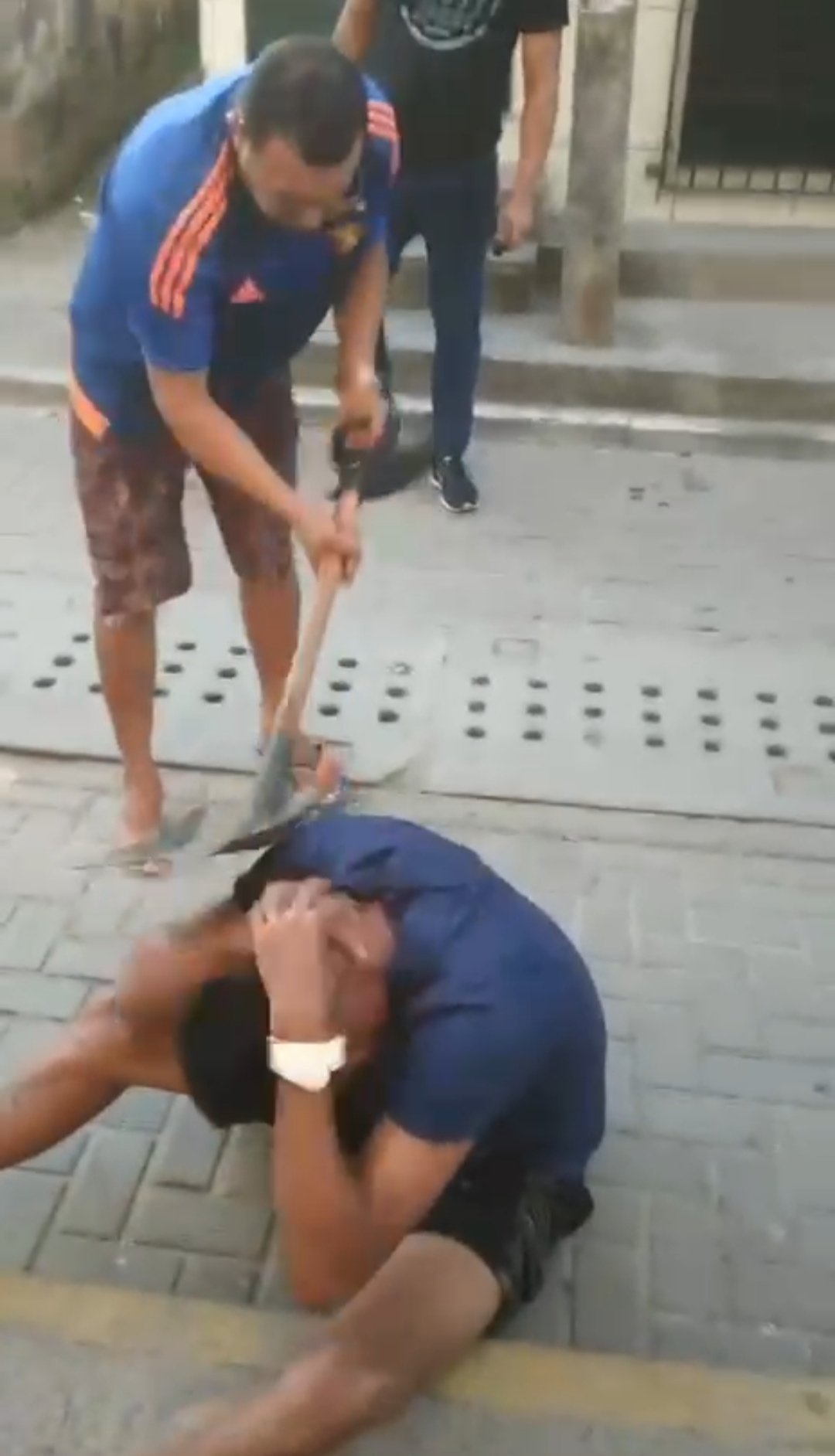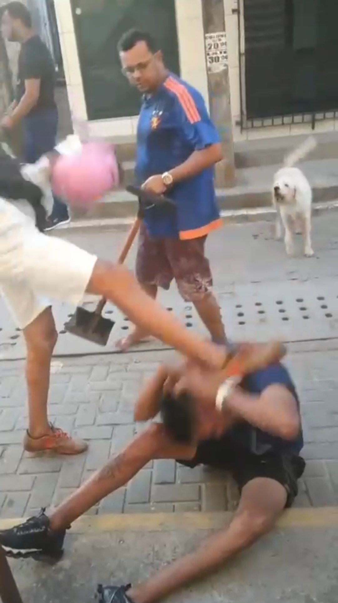 O homem que estava gravando a cena dizendo que o suspeito caído tinha roubado dele, enquanto isso outro cara descia pazadas no elemento, principalmente na cabeça e o barulho era intenso pahhhhhhhh puhhhhhhh pahhhhhhhh e o meliante resistindo bem as pazadas.