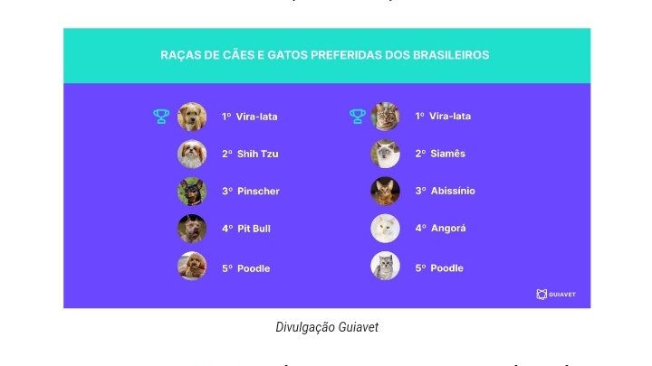 Os vira-latas lideram a lista com 39% de preferência pelos tutores. O segundo lugar fica com a raça ShihTzu (9,5%), e o terceiro, com a Pinscher (6,34%). As demais posições foram para: Pit Bull (4º), Poodle (5º), Yorkshire (6º), Lhasa Apso (7º), Labrador (8º) e Buldogue (9º). Border Collie e Chow Chow empatam na 10º colocação.