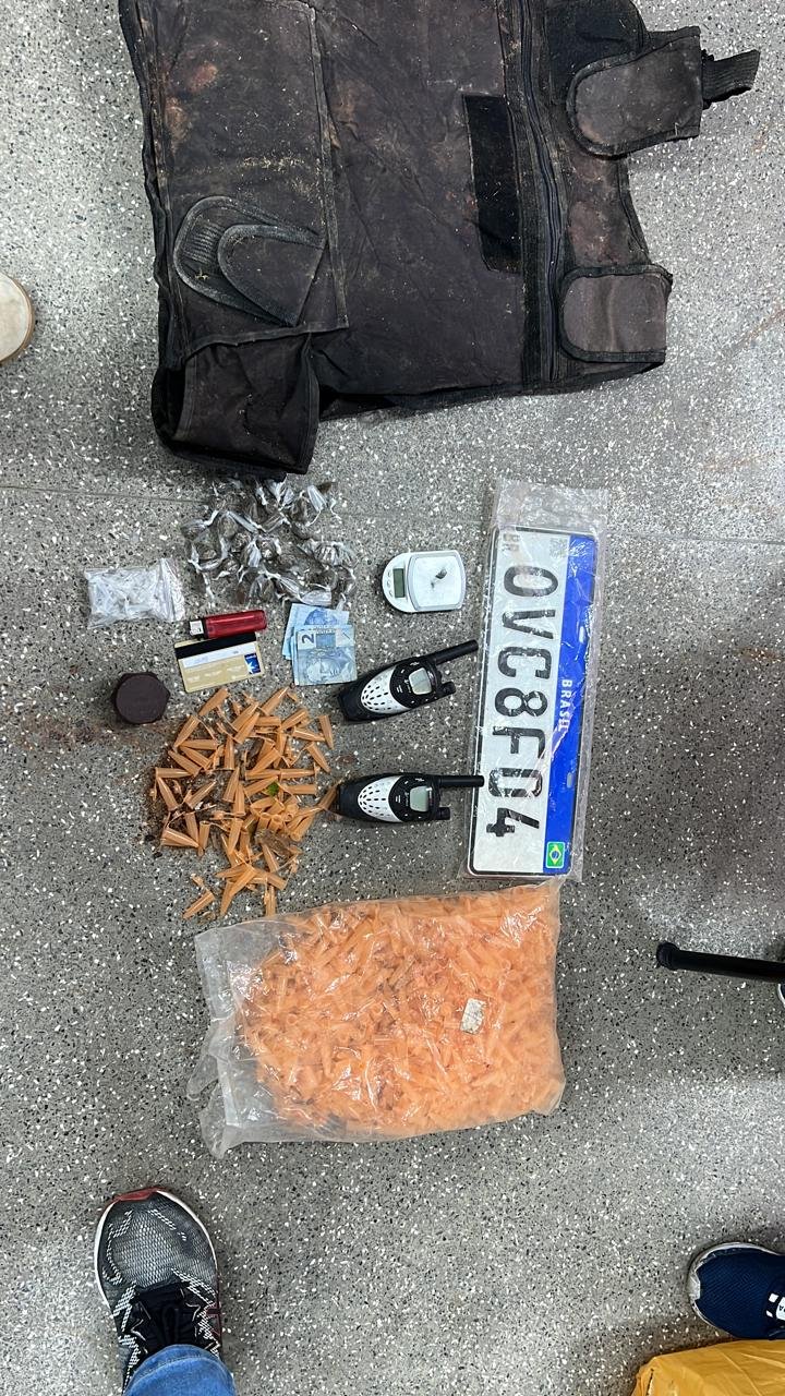 Neste momento, foi dada voz de prisão ao mesmo, ao qual foi conduzido para a presença da autoridade policial que de imediato lavrou o auto por trafico de drogas. ao final desta operação, foi contabilizado a condução de 25 pessoas para averiguação, coletes balísticos, rádios comunicadores, balança de precisão e ,algumas trouxas de maconha e uma farta quantidade de pinos para acondicionar drogas.
