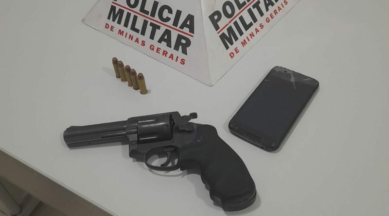 Assim que foi realizada a abordagem pessoal foi localizado em sua cintura um revólver calibre .38, de marca Rossi, e municiado com 5 balas intactas.