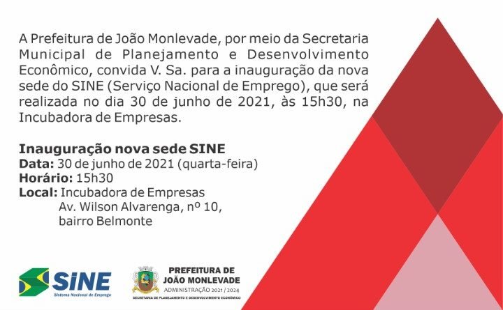 A Prefeitura de João Monlevade, por meio da Secretaria Municipal de Planejamento e Desenvolvimento Econômico, inaugura nesta quarta-feira (30), às 15h30, a nova sede do Sistema Nacional de Emprego (Sine), instalada na Incubadora de Empresas.