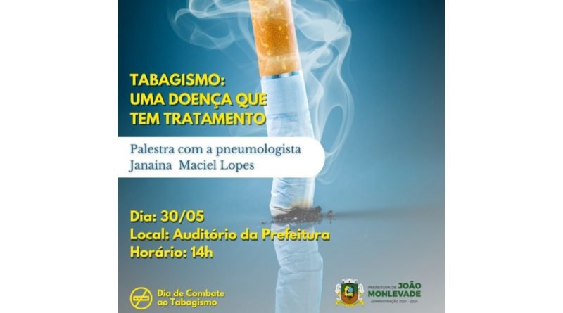 O assunto será abordado pela pneumologista Janaina Maciel Lopes, no auditório Leonardo Diniz, na sede do Executivo Municipal, as 14h. A atividade é aberta a toda a população e será realizada em função do Dia de Combate ao Tabagismo, comemorado em 31 de maio.