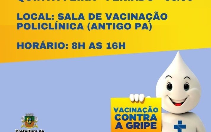 A imunização ocorrerá nesta quinta-feira (3), feriado de Corpus Christi, na sala de vacinação da Policlínica – antigo PA, no bairro Belmonte, de 8h as 16h.