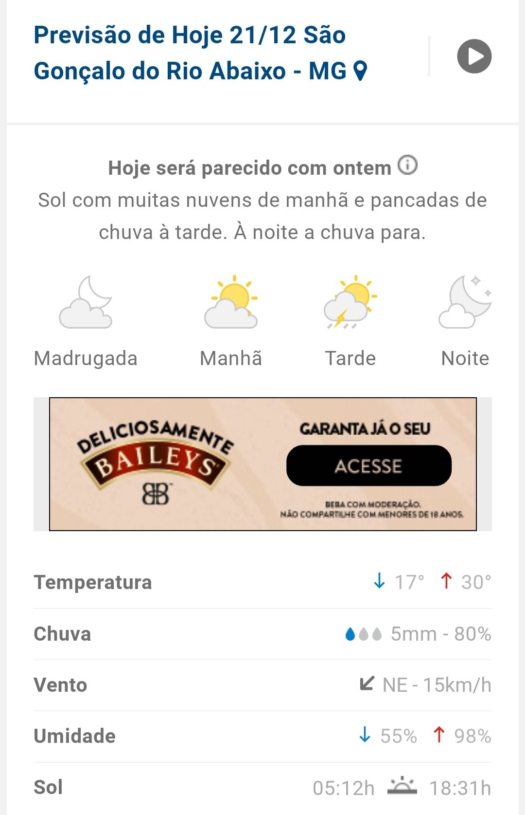 Previsão de tempo São Gonçalo do Rio Abaixo MG 21/12/2021