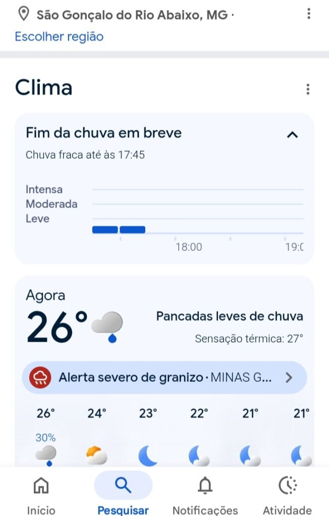 Polícia Previsão do tempo: São Gonçalo do Rio Abaixo, está ameaçando mais ainda não caiu 1 de dezembro de 2025 portaldomediopiracicaba@gmail.com Redação São Gonçalo do Rio Abaixo MG, segunda-feira (01) de dezembro de 2025. Final de tarde, início de noite, são exatamente 17:36 minutos, a chuva já ameaçou, quase caiu. Mas ainda não caiu.