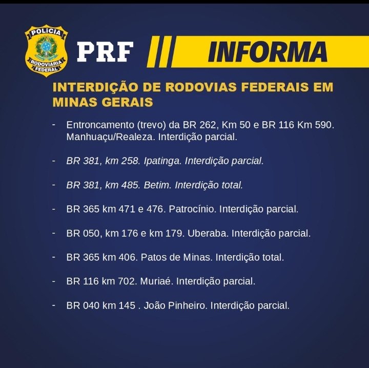 PRF INFORMA ONDE AS RODOVIAS FEDERAIS ESTÃO INTERDITADAS EM MINAS GERAIS (#COMPARTILHE)