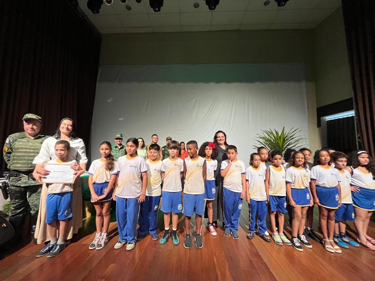 A solenidade de entrega de certificados contou com a presença de alunos, professores, autoridades municipais e representantes da Polícia Militar. O evento também contou com apresentação cultural dos alunos e entrega de medalhas.