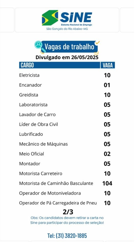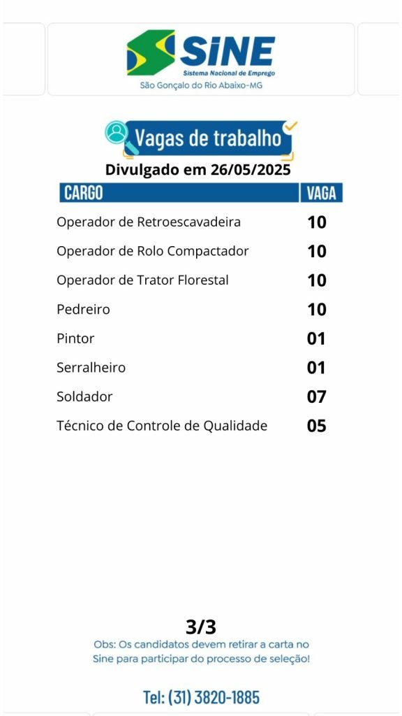 Médio Piracicaba Quase 400 vagas de emprego para está segunda-feira no SINE São Gonçalo do Rio Abaixo (Boa sorte aos candidato) 26 de maio de 2025 portaldomediopiracicaba@gmail.com Redação