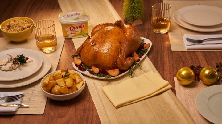- Acomode a ave em uma assadeira média com pelo menos 5 cm de altura e besunte-a com metade da Qualy Cremosa Com Sal. Esfregue na ave, para que pegue o tempero, o alho picado, a páprica defumada, sal e pimenta-do-reino a gosto. Despeje sobre a ave a cerveja preta e cubra com papel-alumínio para evitar que resseque.