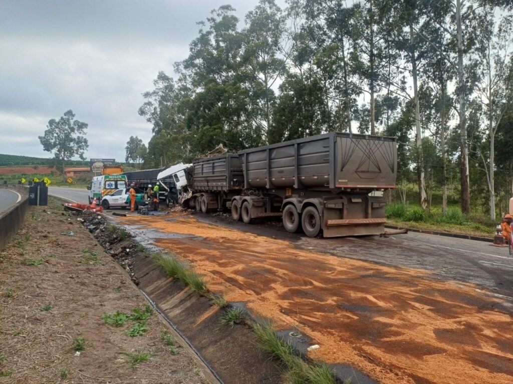 As duas carretas estavam com cargas – uma com uma carga de pisos e a outra com uma carga de sucata prensada. Com impacto da batida, a carga de sucata se espalhou pela via.