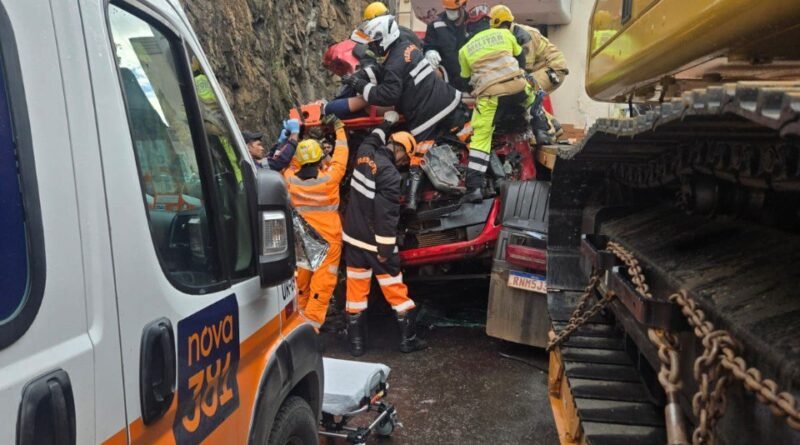 Os militares já desencarceraram a vítima do sexo masculino, aproximadamente 40 anos, consciente e orientado, preso pelas pernas às ferragens da cabine.