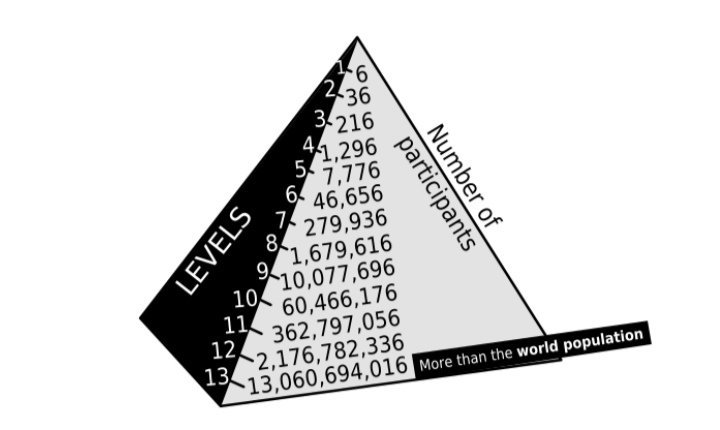 A progressão exponencial insustentável de um esquema de pirâmide clássico em que cada membro é obrigado a recrutar seis novas pessoas. Os 2,2 bilhões de pessoas na 12.ª camada seriam obrigados a recrutar mais 13,1 bilhões de pessoas para a 13.ª camada, para sustentar o esquema, mas isso é maior do que a população.