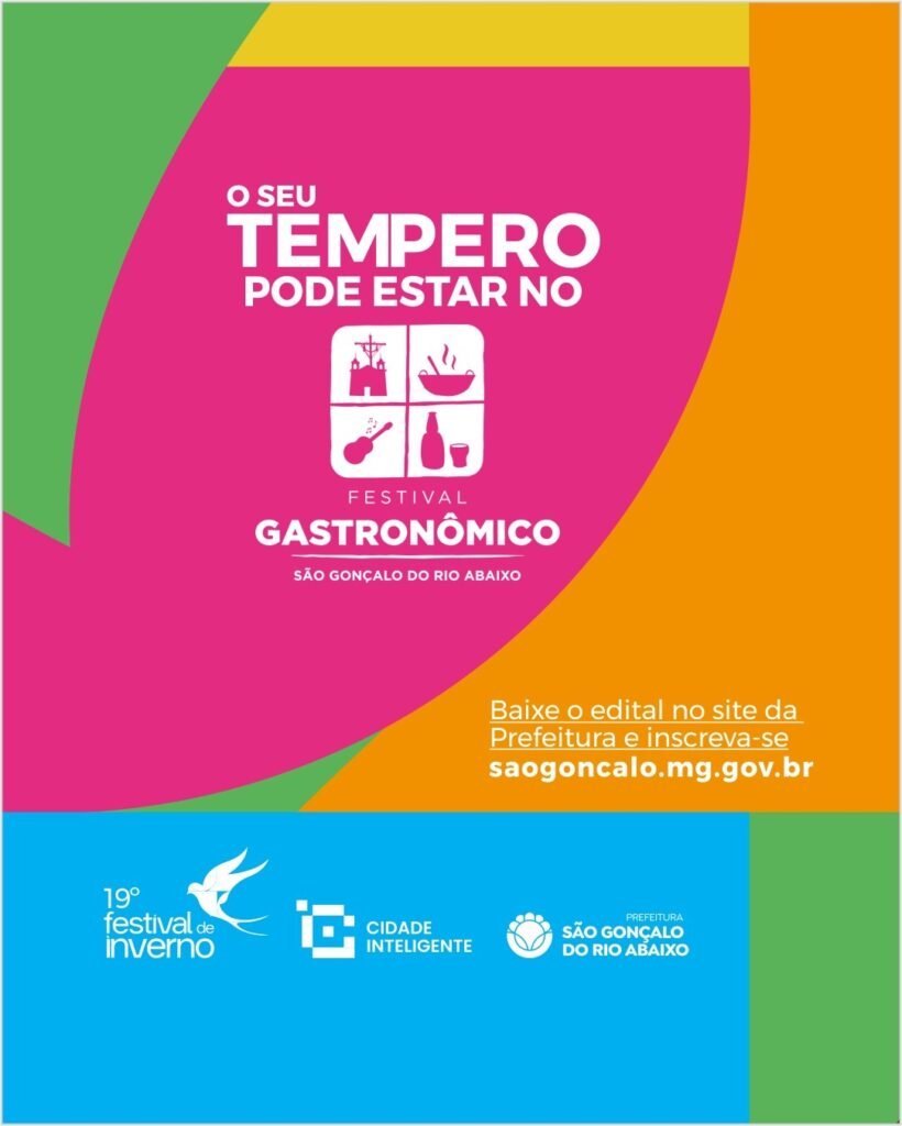 Por meio da Secretaria Municipal de Cultura, a Prefeitura de São Gonçalo do Rio Abaixo lançou o regulamento e abriu inscrições para a participação no 4º Festival Gastronômico da cidade, que acontece de 28 a 30 de julho. O evento faz parte do Festival de Inverno da cidade e as inscrições podem ser feitas de 29 junho a 3 de julho, no Centro Cultural.