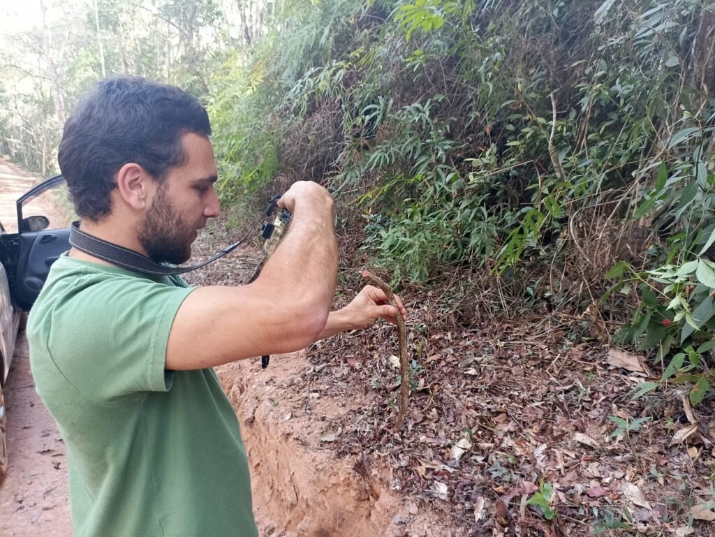 Biólogo, João Victor, em campo para pesquisa de espécies.