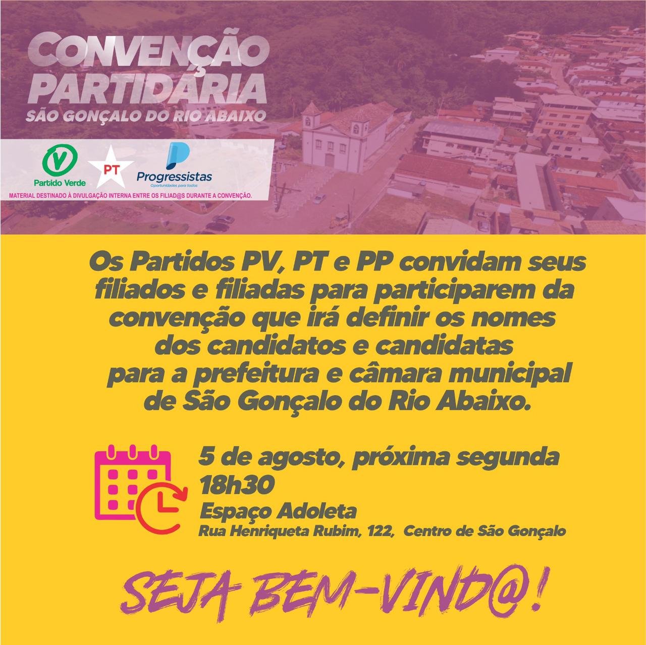 A convenção acontecerá no Espaço Adoleta a partir das 18::30 horas desta segunda-feira, rua Henriqueta Rubim número 122, centro São Gonçalo do Rio Abaixo.