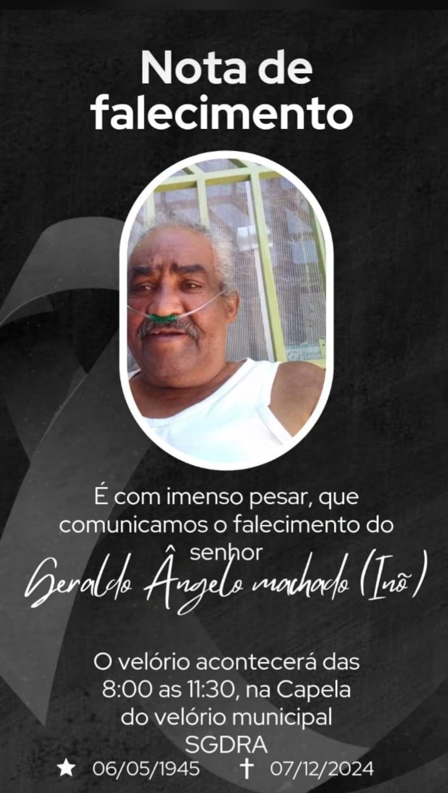 No final da noite de ontem faleceu o senhor Geraldo Angelo Machado, conhecido carinhosamente como (Inô. Senhor Geraldo era morador da comunidade do Una, aposentado e que sempre trabalhou para cuidar da família.