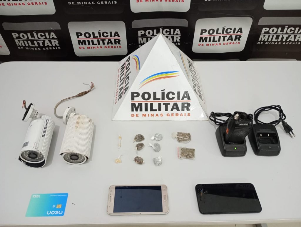 O material encontrado incluiu porções de maconha e pedras de crack, além de dois celulares e um cartão bancário. Os policiais também descobriram um aparato de segurança composto por câmeras de monitoramento, rádio comunicador e bases carregadoras, indicando uma operação mais elaborada.