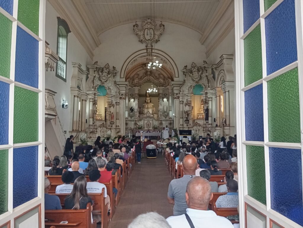 Georgia de Fátima é mãe do Padre Gustavo Silva, e neste momento está tendo a missa de corpo presente na Igreja Matriz de São Gonçalo do Rio Abaixo.