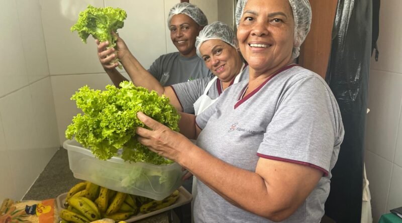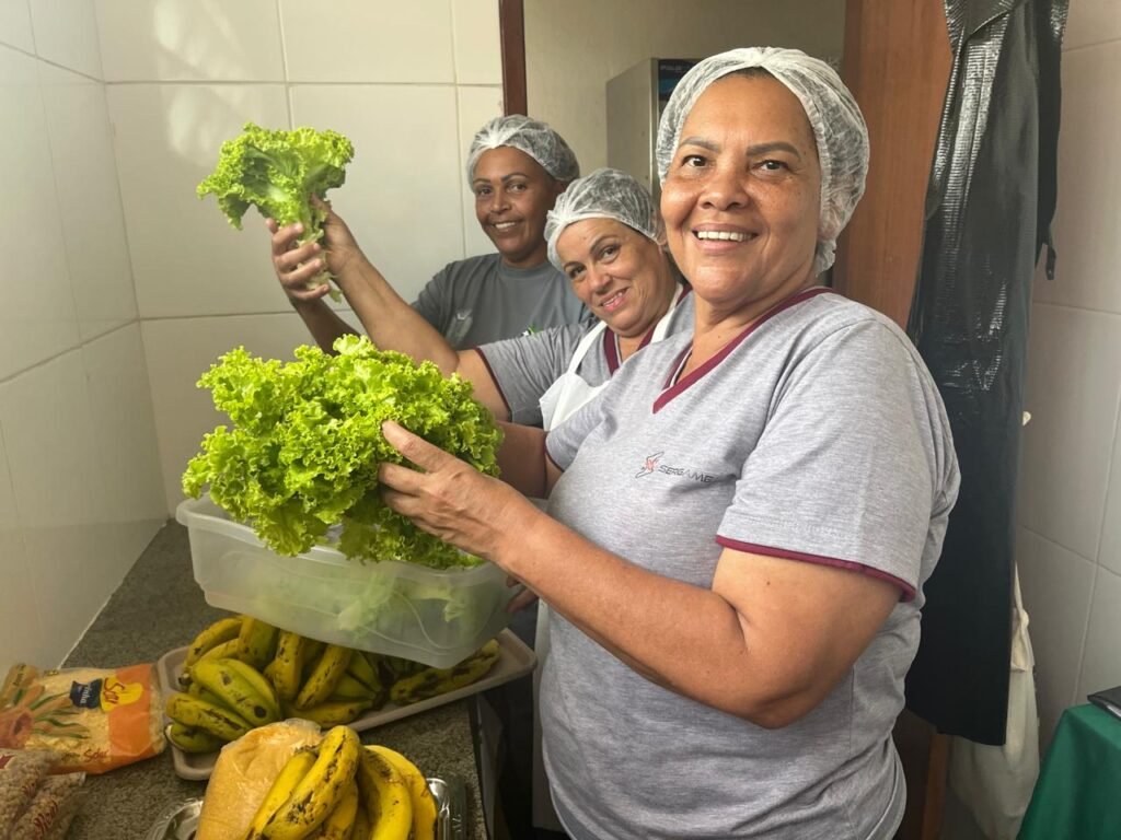 Na cozinha da Escola Municipal Manoel Gonçalves, servidoras mostram produtos da agricultura familiar.