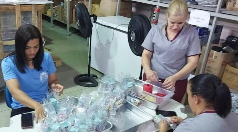Equipe do almoxarifado da educação montam kit para as crianças.