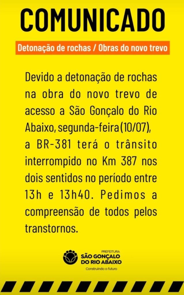 SÃO GONÇALO: HOJE TEM DETONAÇÃO DE ROCHAS NA BR-381