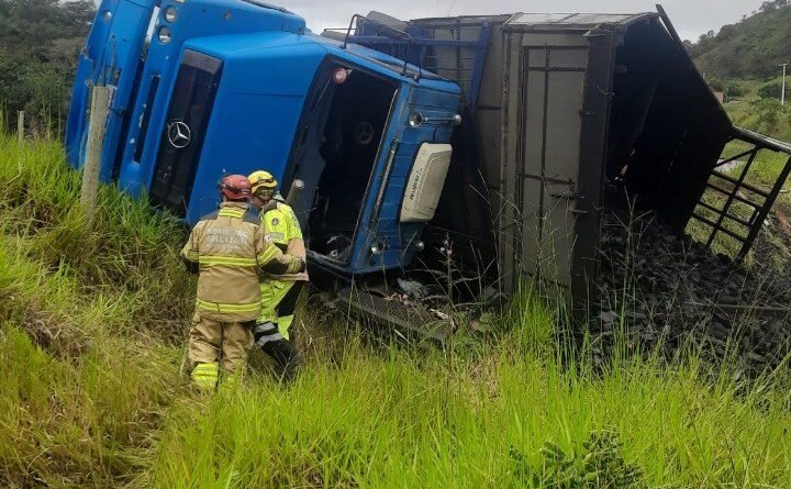 No local, um caminhão carregado com carvão tombou sobre uma caminhonete. O veículo ficou preso sob a carga e seu condutor teve o óbito constatado por um médico do Samu.