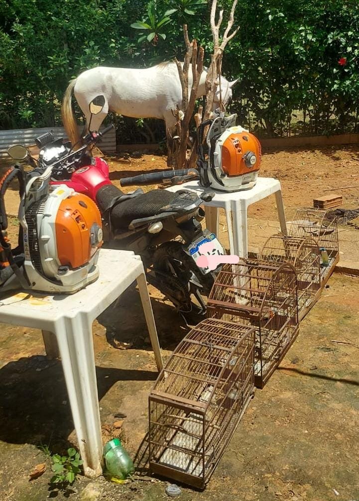 No local, também foram encontrados dois sopradores Stihl BR 600, uma moto XRE 300 com sinais de adulteração, pássaros silvestres, gaiolas e materiais usados em pesca predatória.