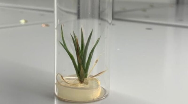 Espécime de Dyckia sp. germinada via técnica de cultura in vitro e em desenvolvimento nos laboratórios da URPD de Piracicaba da APTA.