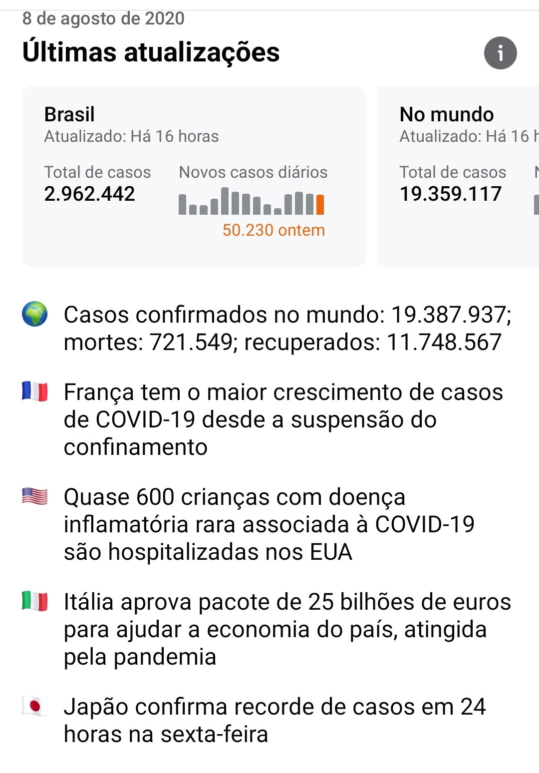 Secretaria de Saúde do estado de MG mais boletim do Covid-19 no mundo 08/08/2020