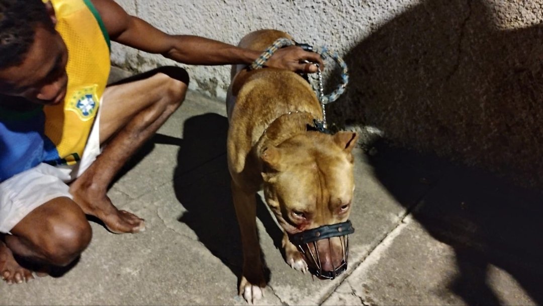 Segundo depois a Pitbull acabou soltando o animal tentando atacar uma outra pessoa no local, porém com o auxílio dos tutores o animal foi contido e preso a coleira.