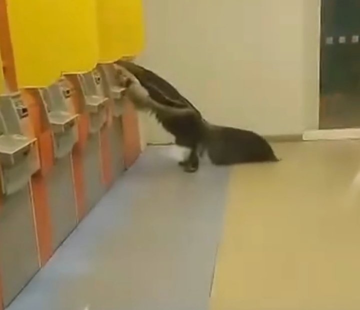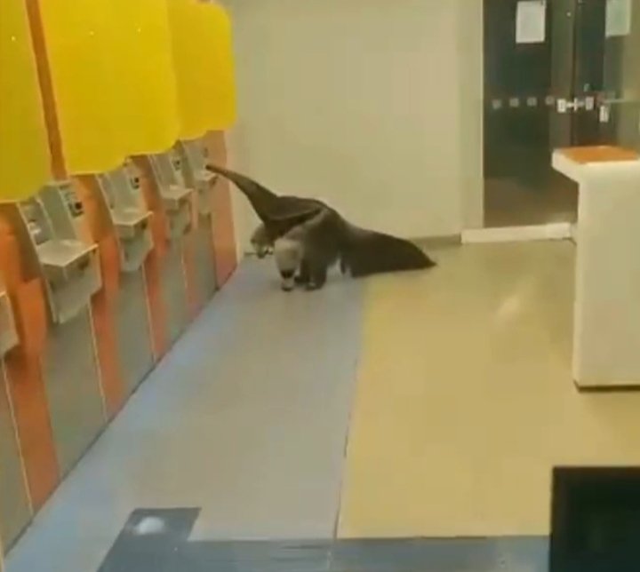 Como vocês podem ver nas imagens, o Tamanduá Bandeira estava em uma agência bancária tentando retirar o prêmio em um caixa eletrônico.
