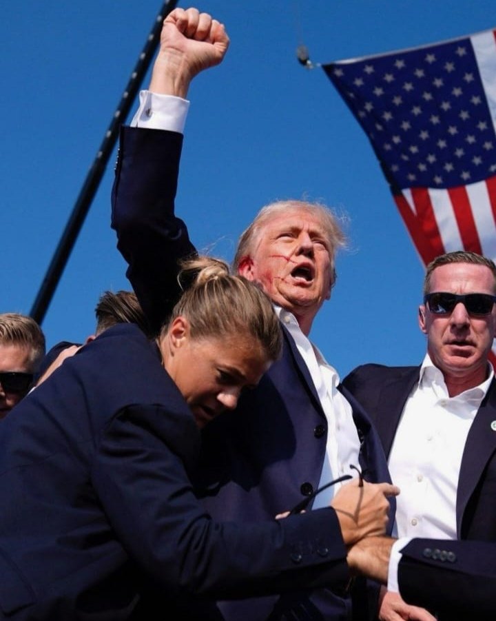 Donald Trump está bem, o tiro acertou de raspão na orelha, e mesmo após ser atingido levantou erguendo o braço direito.