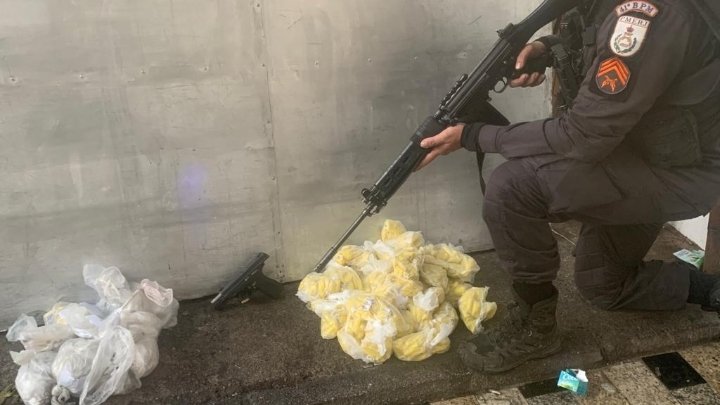 Os meliantes estavam armados com uma pistola e portando inúmeros pedaços de drogas semelhante a cocaína, além de pedaços de drogas semelhante a maconha.
