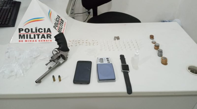 Dando seguimento na verificação pelo trajeto percorrido pelo suspeito, os Militares encontraram escondido um revólver calibre 32 carregado com duas munições intactas, quarenta pinos cheios de cocaína, 30 pedras de crack, um tablete de maconha, uma balança de precisão, um relógio de pulso, encontraram também vários saquinhos plástico utilizados para acondicionar entorpecentes, um vidro de loló e cerca de R$19,00 reais e um aparelho de celular.