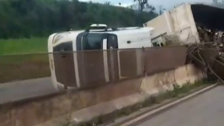 Onde um motorista de uma carreta carregada com sucatas, perdeu o controle do veículo e tombou sobre a alça da duplicada, o que está causando lentidão no trânsito.
