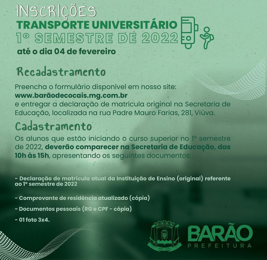 A Prefeitura, por meio da Secretaria de Educação, informa que será realizado até o dia 04 de fevereiro o recadastramento e cadastramento do Transporte Universitário para o 1° semestre de 2022.