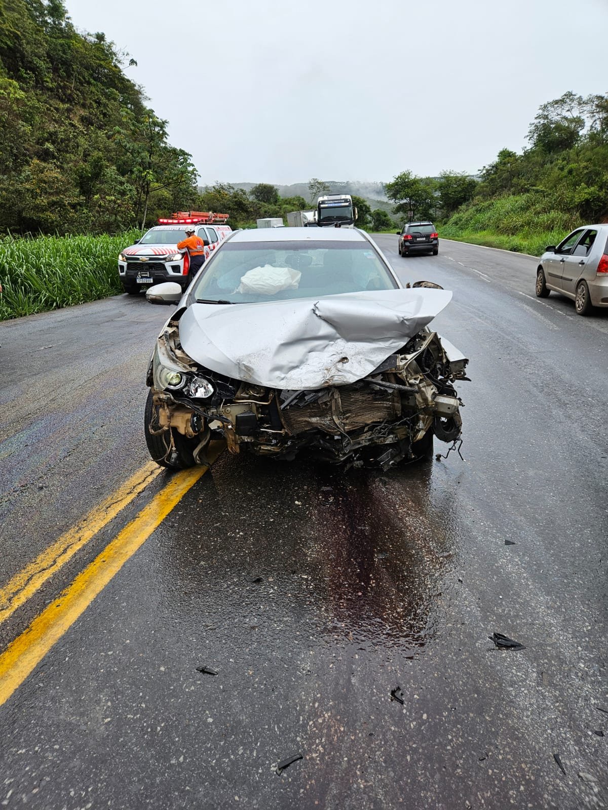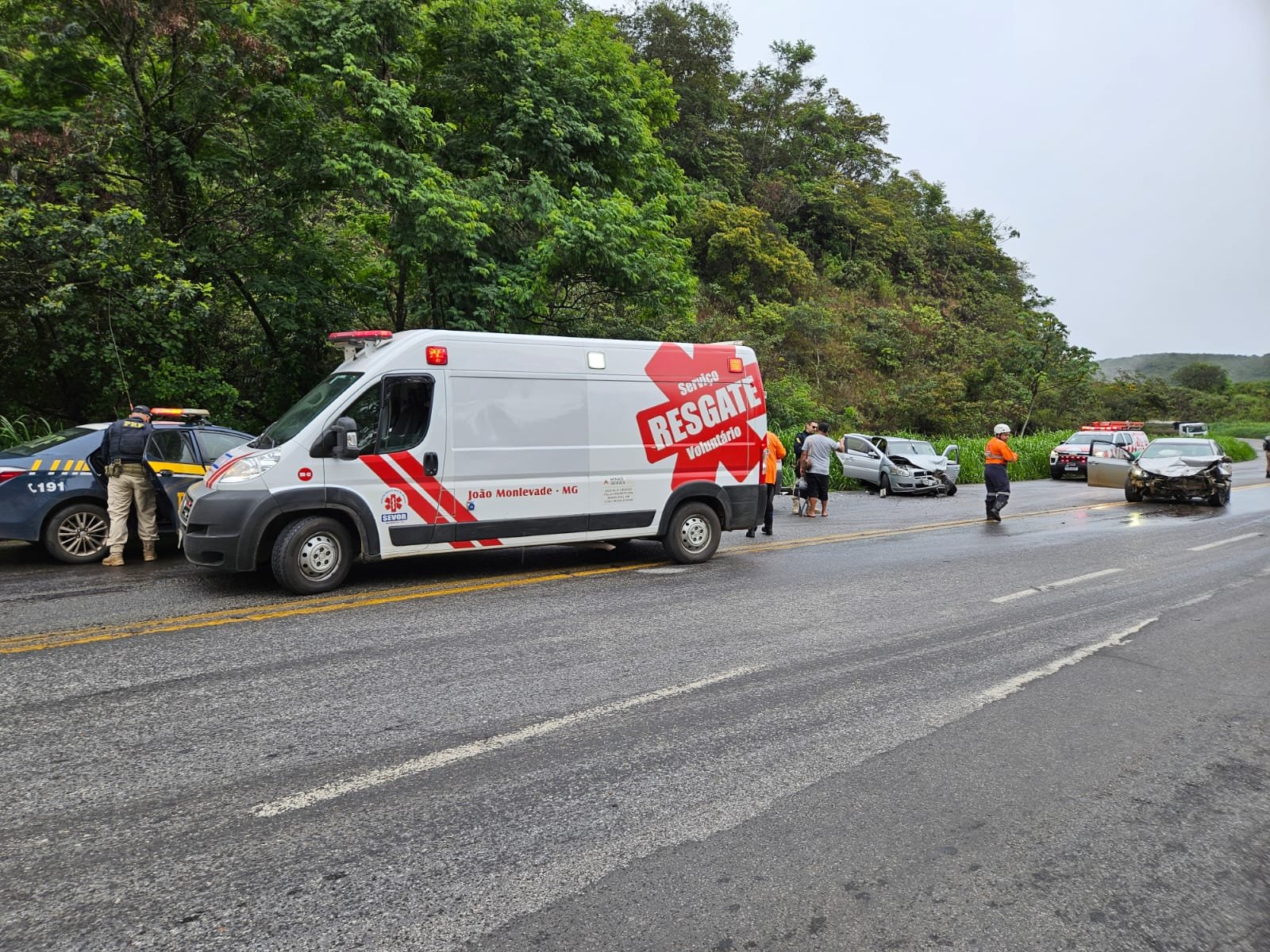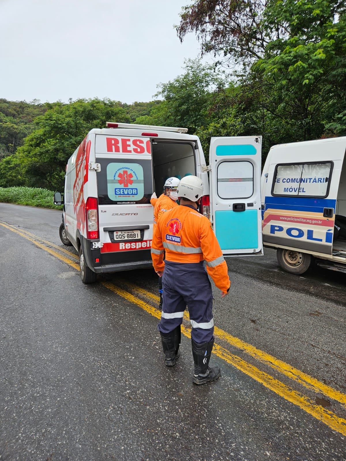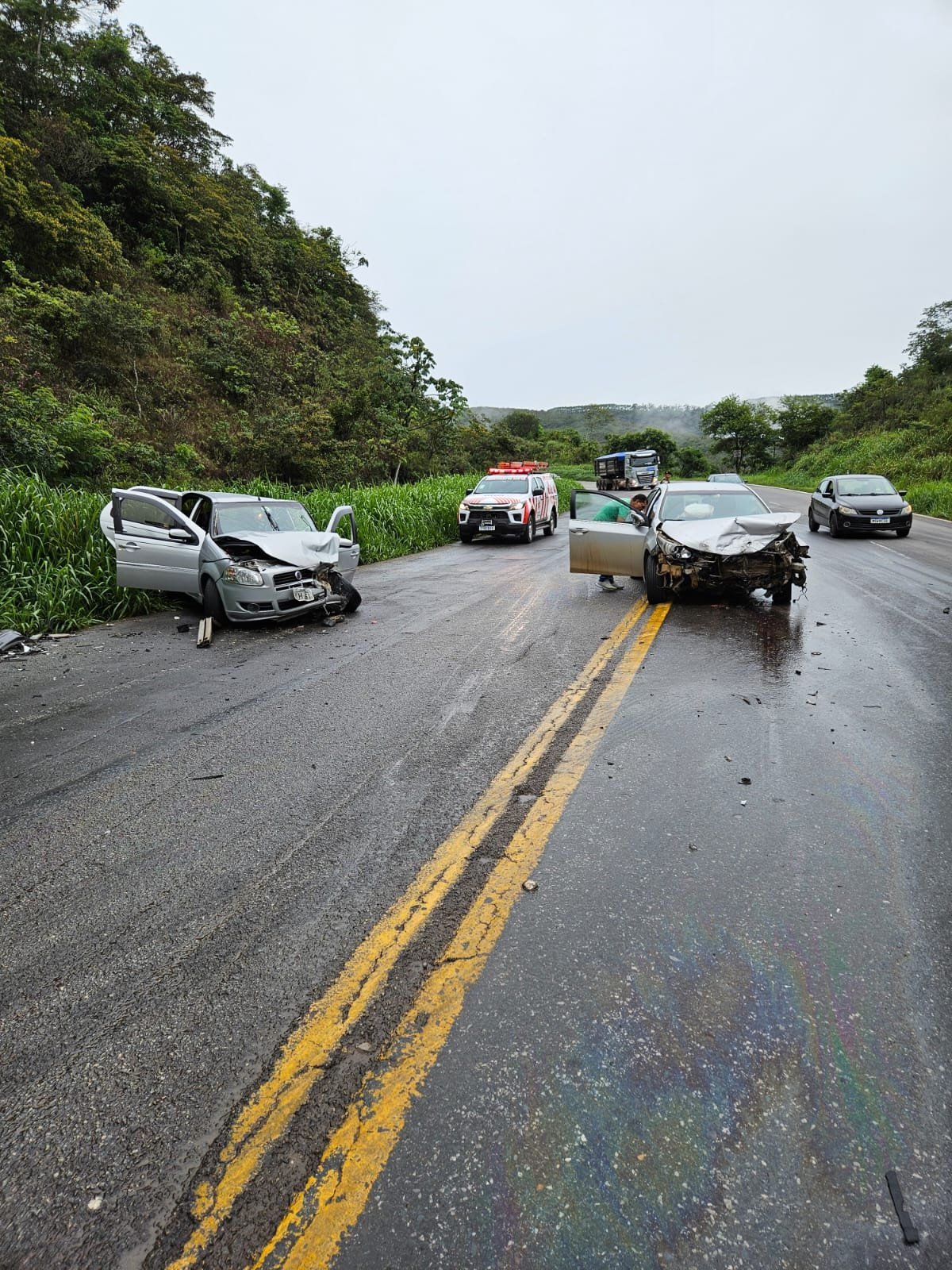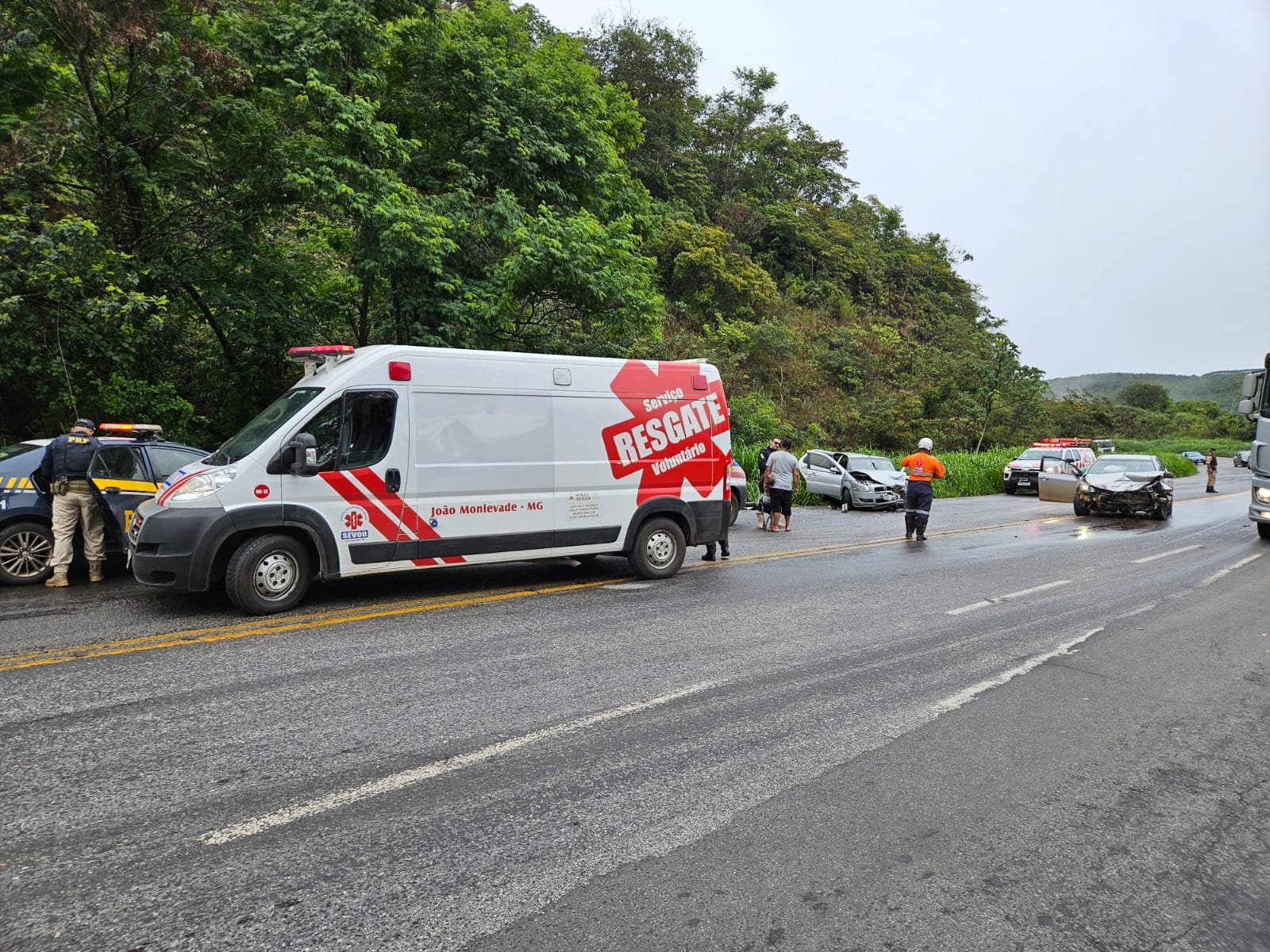 O primeiro em frente Lanchonete Cascata, colisão veículo X carreta Bombeiro Militar de João Monlevade atendeu, pois o SEVOR estava indo para acidente no KM 376 Mãe dAgua.