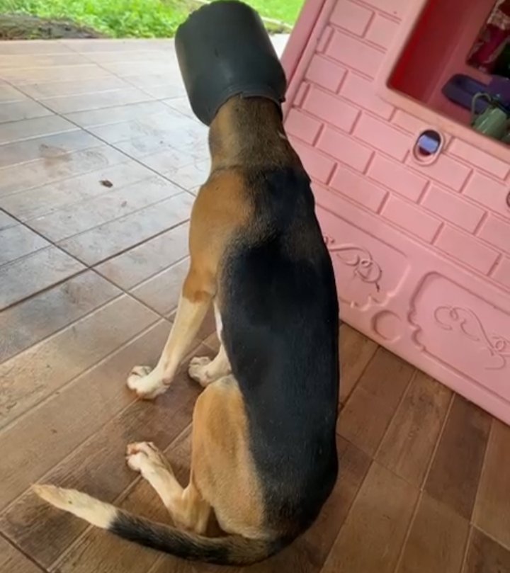 O Corpo de Bombeiros foi acionado pela responsável do animal. Logo que chegaram ao local, os bombeiros conseguiram retirar a leiteira da cabeça do cachorro.