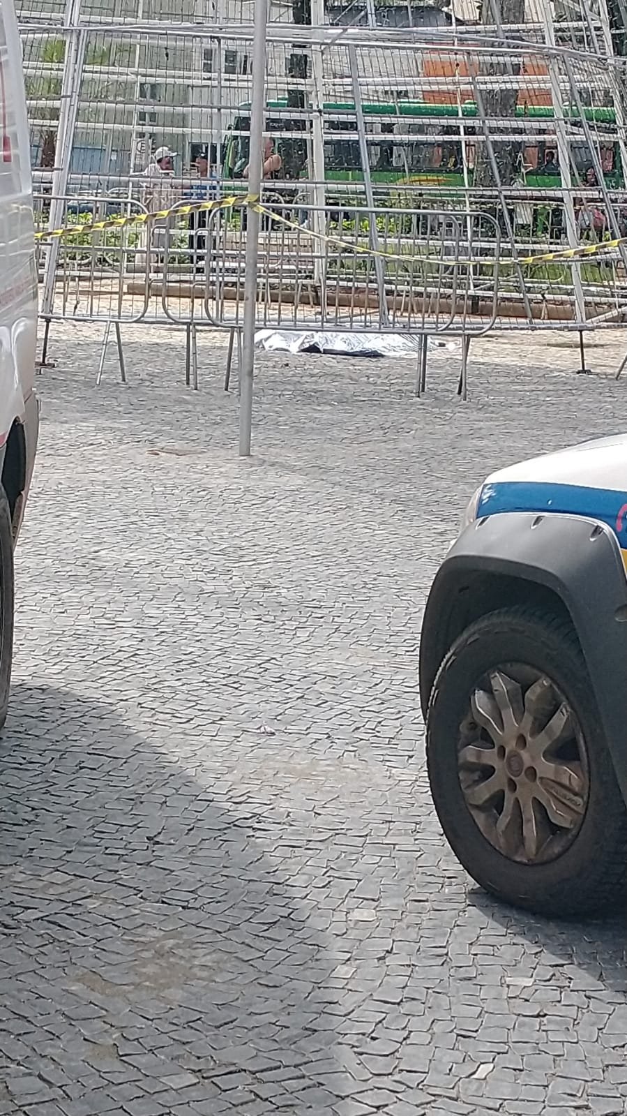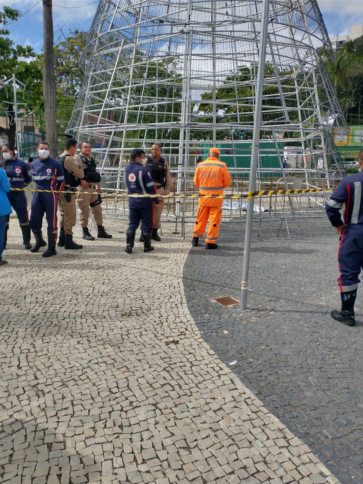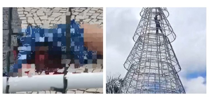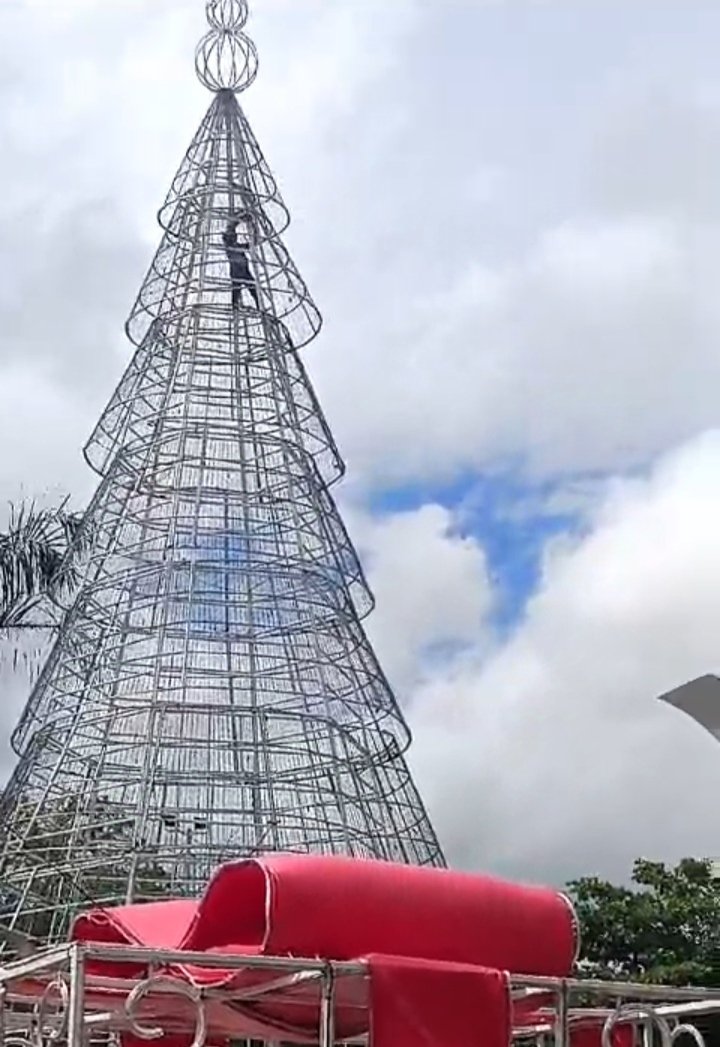 Onde na tarde deste sábado, a princípio, uma pessoa do sexo feminino subiu em uma árvore de natal feita por barras de metais e se jogou lá de cima, de uma altura de mais de 10 metros.