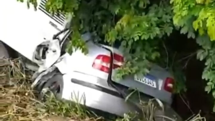 A carreta arrastou o carro e os dois veículos saíram da pista. A batida foi tão forte que o motor do carro chegou a ser arrancado e apenas o porta-malas do veículo ficou inteiro.