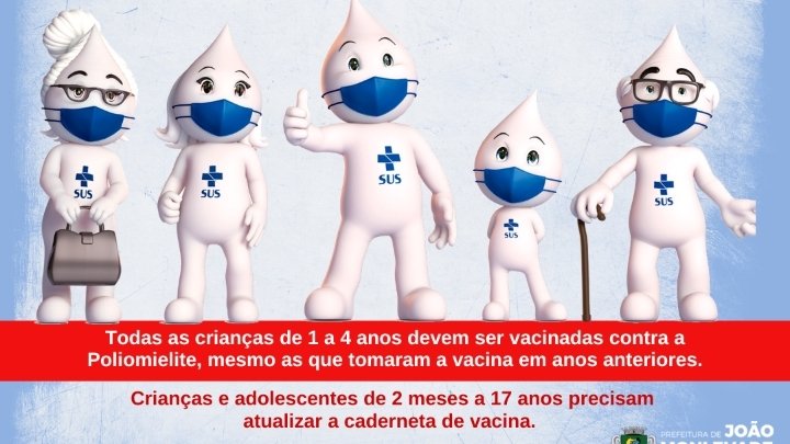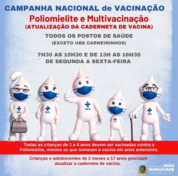 A Prefeitura de João Monlevade continua com a Campanha Nacional de Vacinação contra a Poliomielite e a Multivacinação para atualização da caderneta de vacina ao longo desta semana (22 a 26/8).